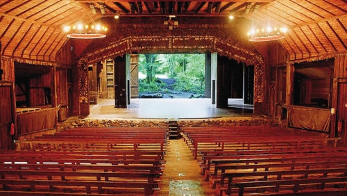 Aparté : Ce théâtre incroyable existe réellement, à Bussang dans les Vosges. Lors de certains spectacles, le fond s'ouvre sur la forêt qui s'intègre au spectacle. C'est mag(n)i(fi)que :