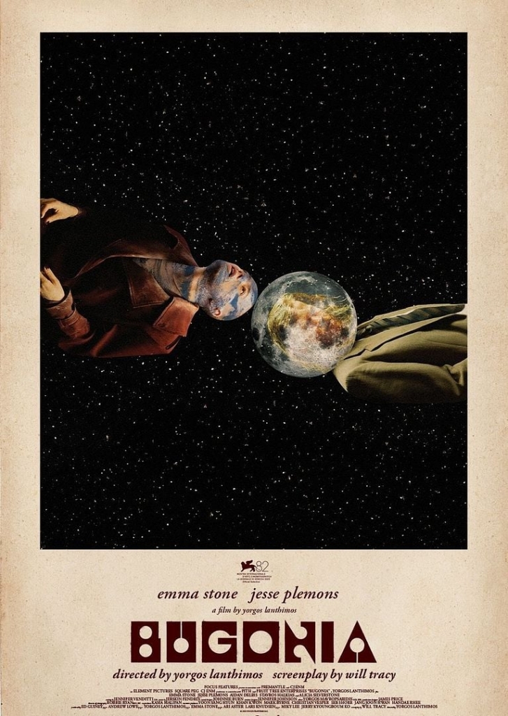 J'ai effectué quelques recherches à propos du titre. Comme j'entendais les autres spectateurs annoncer BEGONIA en demandant leur ticket... j'ai pensé qu'il s'agissait de la fleur et que j'avais mal lu le titre sur l'affiche (penser à prendre confiance en toi). Que nenni, il s'agit bien de BUGONIA et (merci wiki) : La bugonia ou bougonie, du grec βοῦς (bœuf) et γονή (progéniture), littéralement «progéniture du bœuf», est un rituel sacrificiel rapporté par divers auteurs de l'Antiquité et attribué aux anciens égyptiens fondé sur la croyance que les abeilles peuvent naitre du cadavre d'un bovin. S'il est question d'abeilles à trois reprises, cela ne nous aide pas à comprendre le nouveau délire de Yorgos mais au moins désormais nous tenons l'étymologie de bugonia ce qui peut être une occasion de briller dans les dîners en ville ou au Jeu des mille euros.